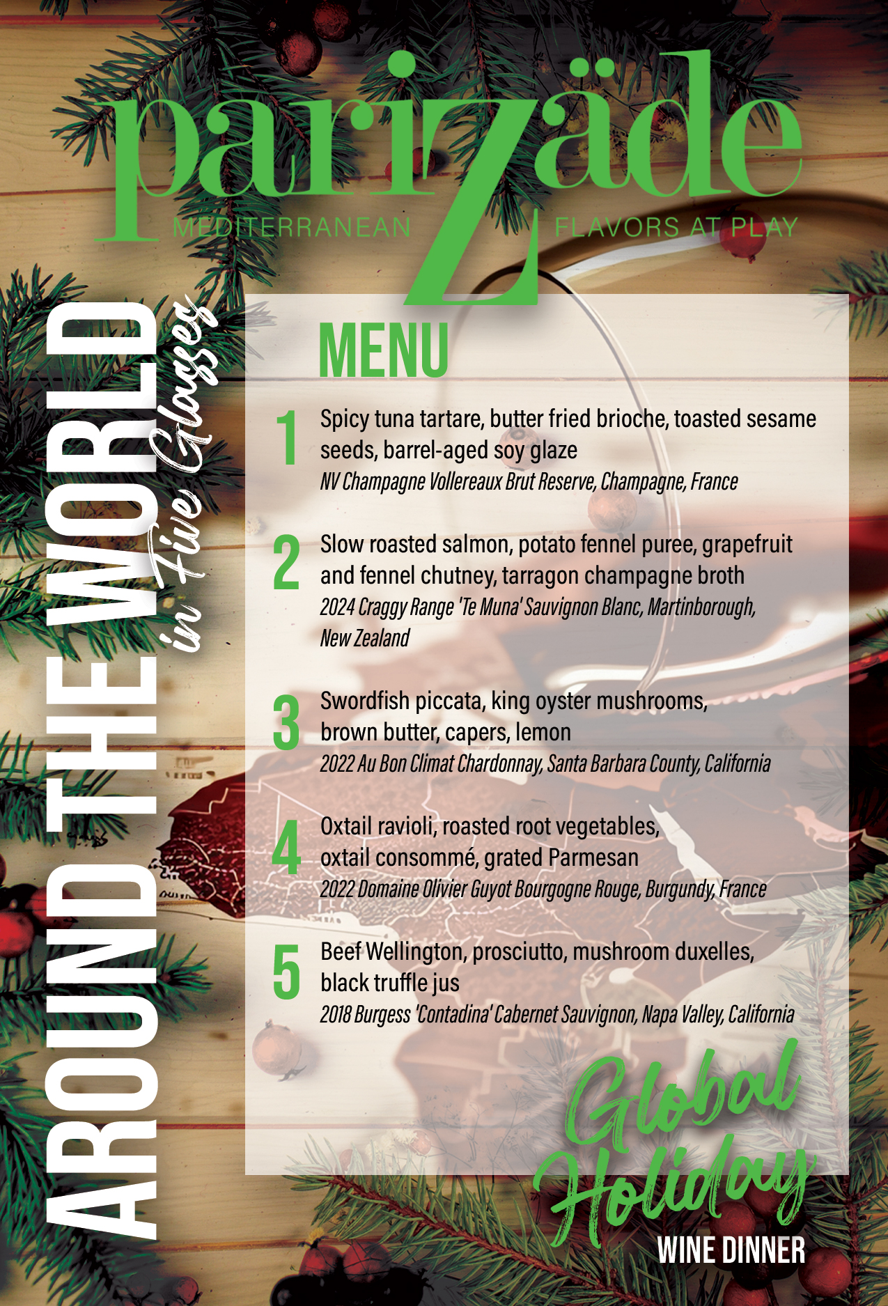Celebrate the season with a world tour of flavor. Join us at Parizade for a great Global Holiday Wine Dinner, featuring five exquisite courses expertly paired with wines from around the world.