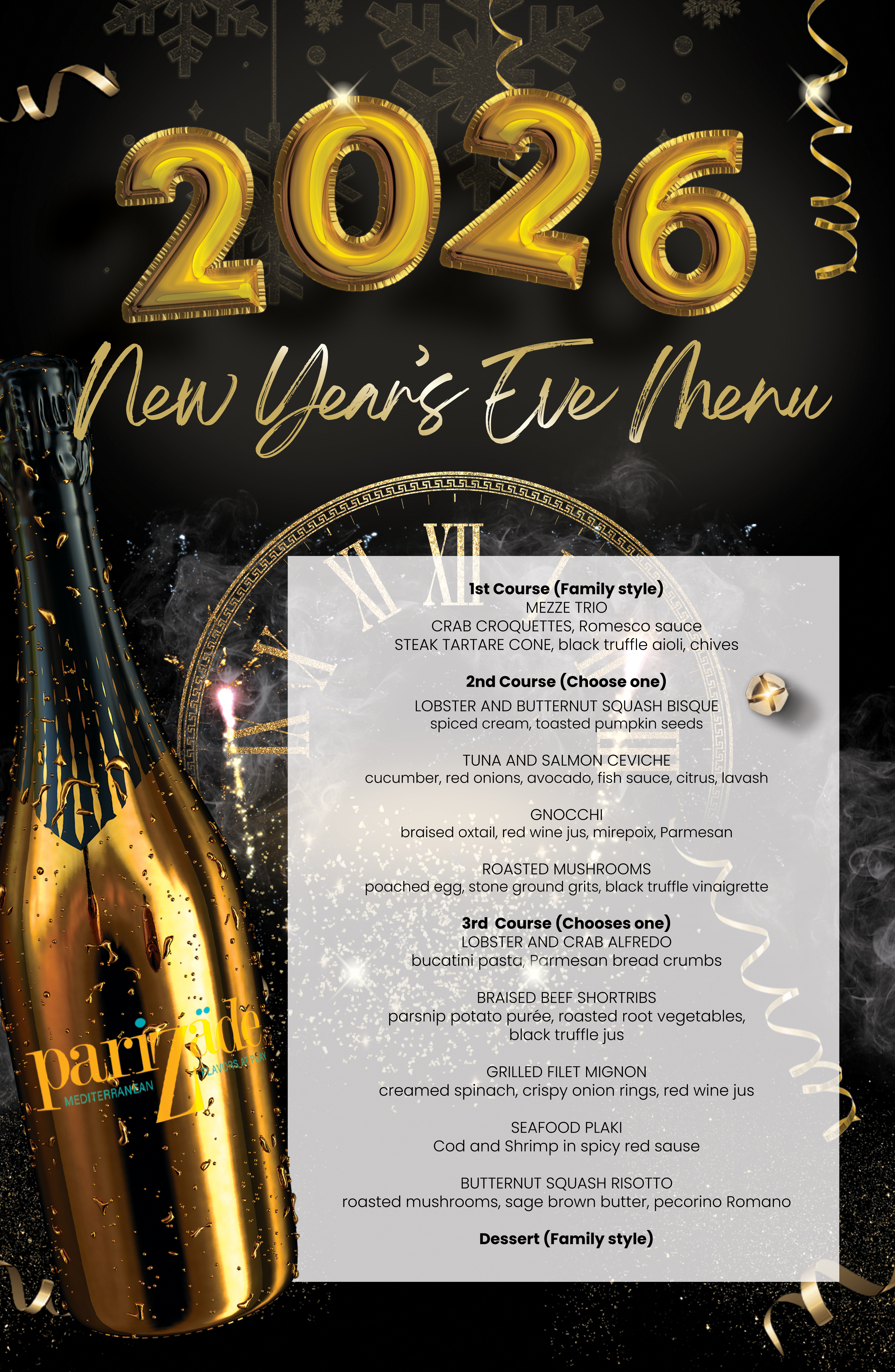 Come ring in 2026 at Parizade! Our annual New Year's Party is $130 per person and includes a four course menu, live music from The Retro Band, dancing, party favors, and a champagne toast at midnight. Seatings are available at 9:00, 9:15, and 9:30 and the party lasts until right after the ball drops. This event always sells out so reserve your seats today - cheers!